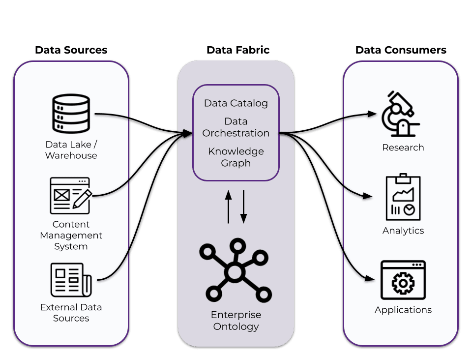 An architecture diagram showing a data fabric layer mediating between data sources and data consumers. The data fabric is comprised of an enterprise ontology and other systems such as a data catalog, data orchestration, and a knowledge graph. Information about data sources (such as a data lake, data warehouse, content management system, or external data sources) flows into the data fabric, which connects that information with data consumers (such as research teams, analysts, and applications).