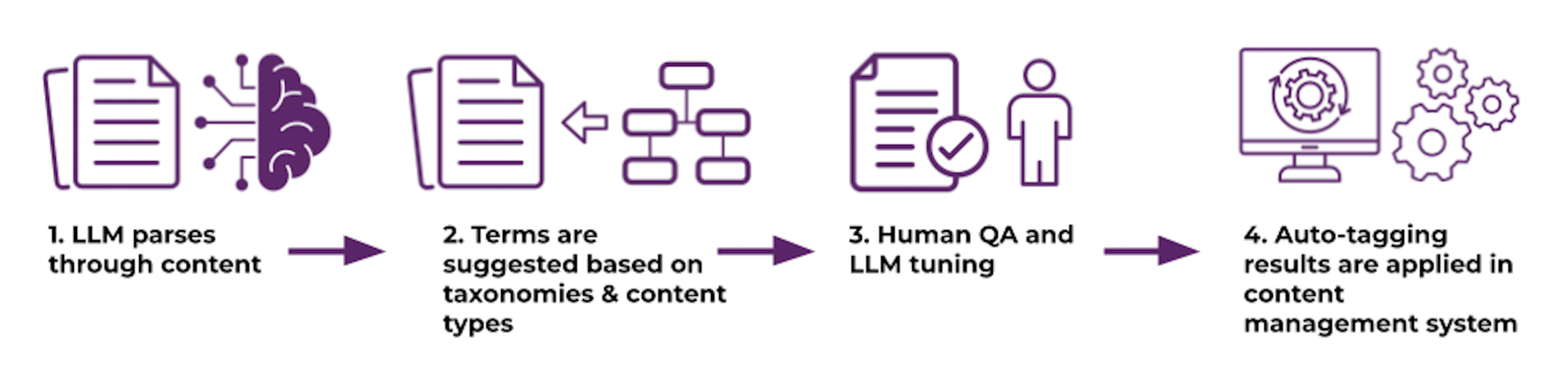 Similar to existing auto-tagging approaches, the LLM suggests a tag by parsing through a piece of content, processing and identifying key phrases, terms, or structure that gives the document context. Through prompt engineering, the LLM is then asked to compare the similarity of key semantic components (e.g., named entities, key phrases) with various term lists, returning a set of terms that could be used to categorize the piece of content. These responses can be adjusted in the tagging workflow to only return terms meeting a specific similarity score. These tagging results are then exported to a data store and applied to the content source. Many factors, including the particular LLM used, the knowledge an LLM is working with, and the source location of content, can greatly impact the tagging effectiveness and accuracy. In addition, adjusting parameters, taxonomies/term lists, and/or prompts to improve precision and recall can ensure tagging results align with an organization’s needs. The final step is the auto-tagging itself and the application of the tags in the source system. This could look like a script or workflow that applies the stored tags to pieces of content.