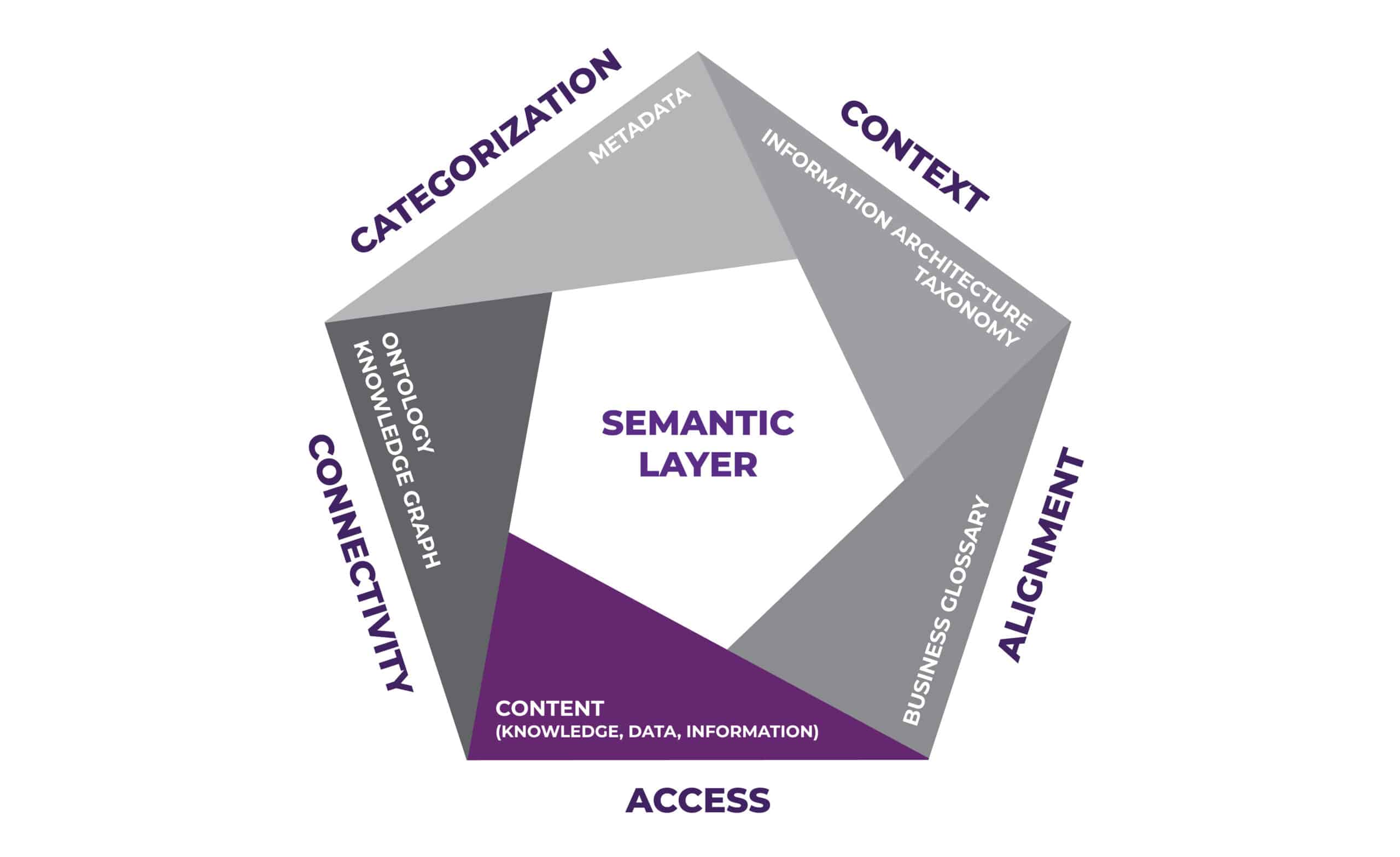 A semantic layer is a standardized framework that organizes and abstracts organizational data (structured, unstructured, semi-structured) and serves as a data connector for data and knowledge. Larger than a data fabric, which is more focused on structured data, a semantic layer connects all organizational knowledge assets via a well-defined and standardized semantic framework, including content items, data, files, and media. It allows organizations to represent organizational knowledge and domain meaning to systems and applications, defining the relationship between content and data.